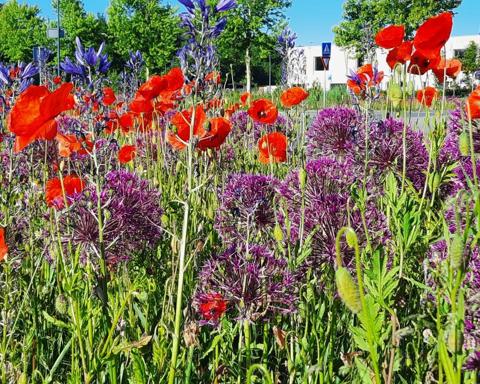 Over de bonte berm van de rotonde zeggen ze: ‘Door de positieve ontwikkeling bevindt de vegetatie zich aan het einde van jaar 1 al voor het grootste deel in de categorie ‘bloemrijk grasland’. Dat betekent dat er al veel gewenste twee- en meerjarige soorten zijn waargenomen. Hiervan hebben de meeste nog niet of nauwelijks gebloeid, maar ze zijn als rozet waargenomen.’