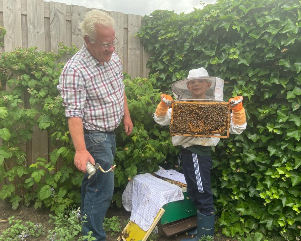 Yaniek heeft sinds twee maanden een eigen bijenvolk: een kast met raten van was, waar circa 10.000 bijen in wonen. Deze staat in de tuin naast het huis, vanwaar ze de hele buurt in gaan om stuifmeel te verzamelen. Een bijzonder proces, waar Yaniek al heel veel van weet. Want opa Martin is al jaren fervent imker. En hij is nu de hulplijn van Yaniek.